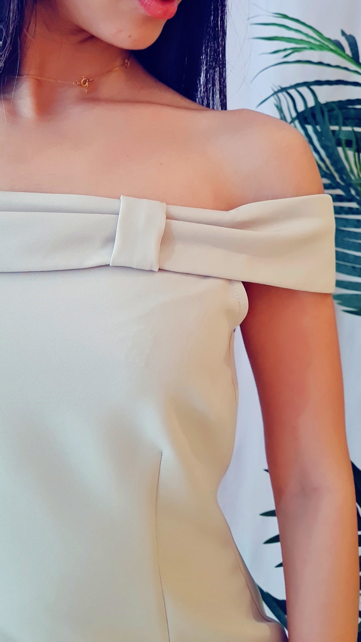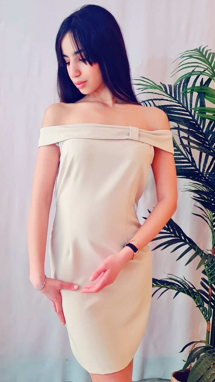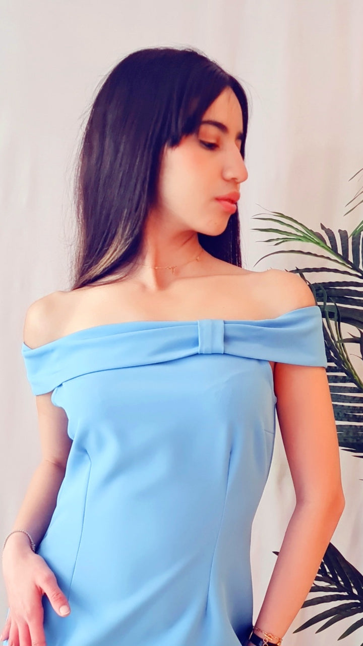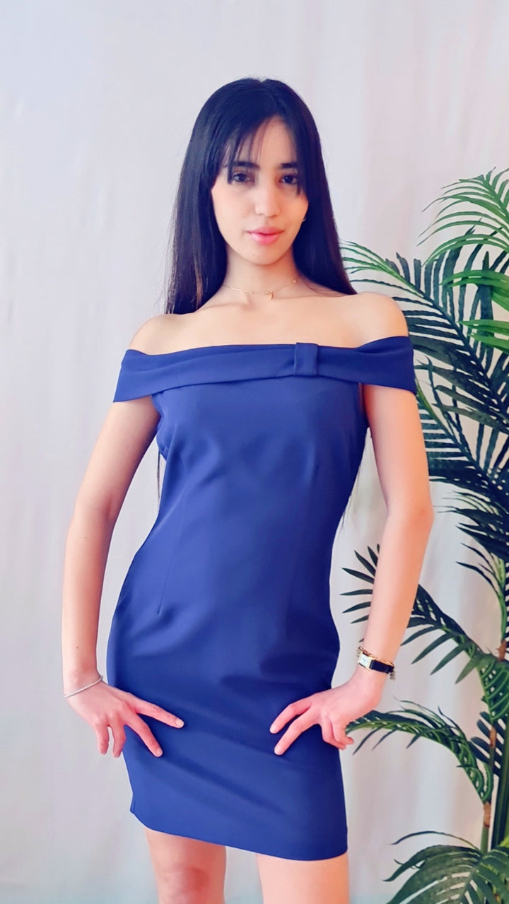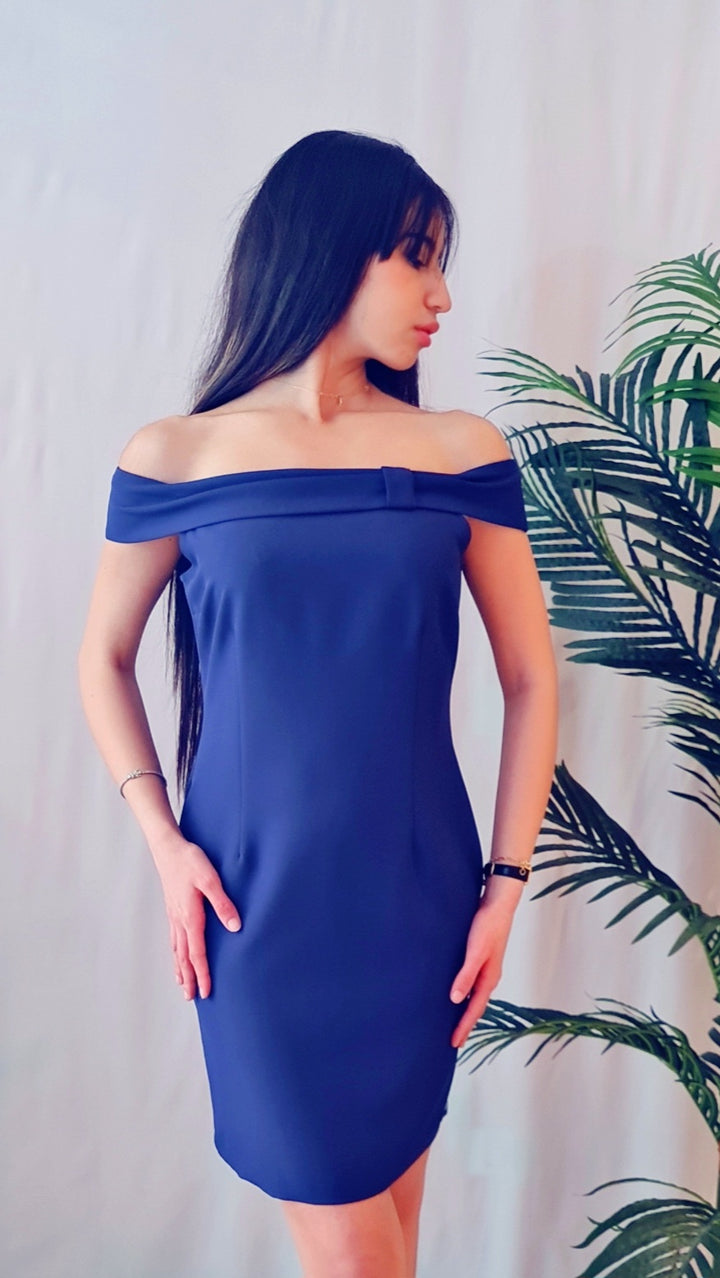 Abito a tubino in tessuto tecnico con scollo alla bardot e dettaglio fiocco.