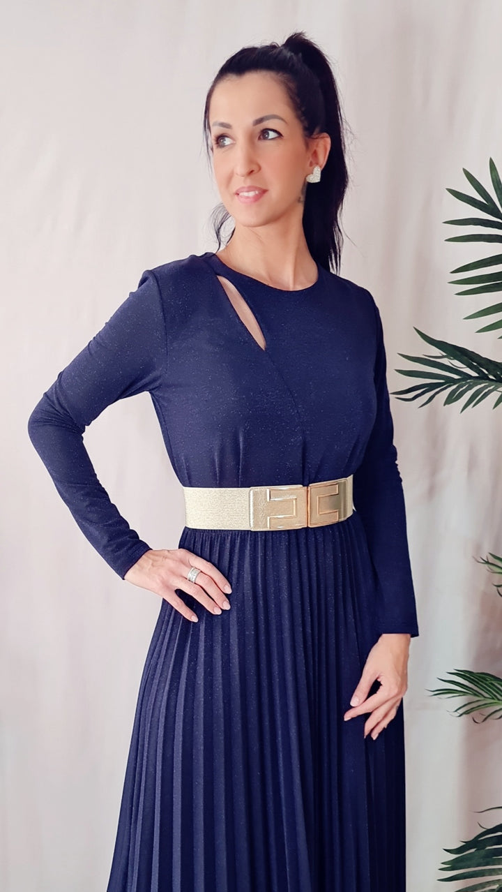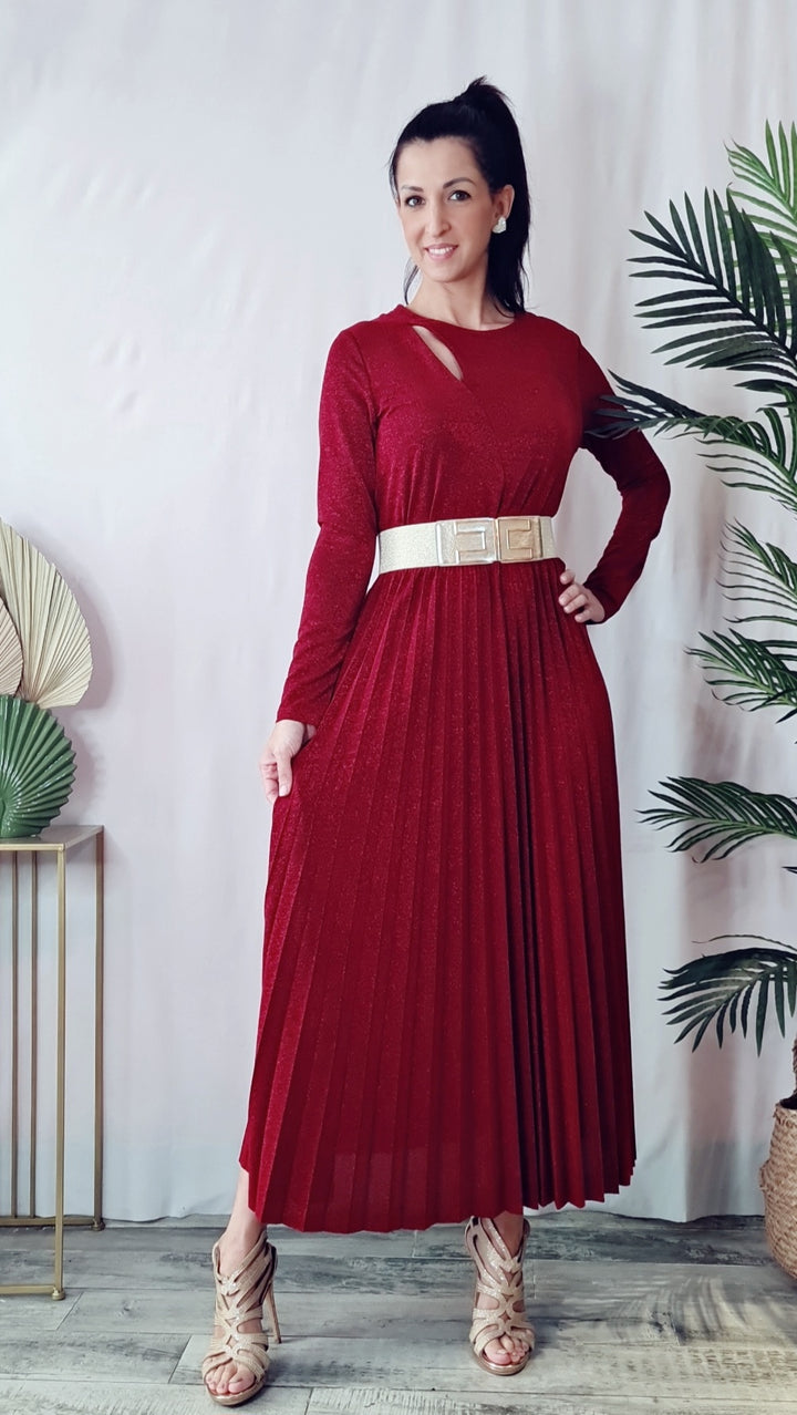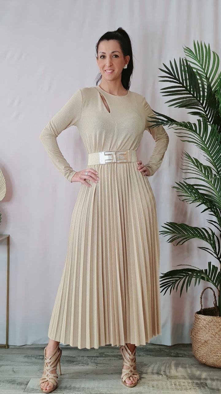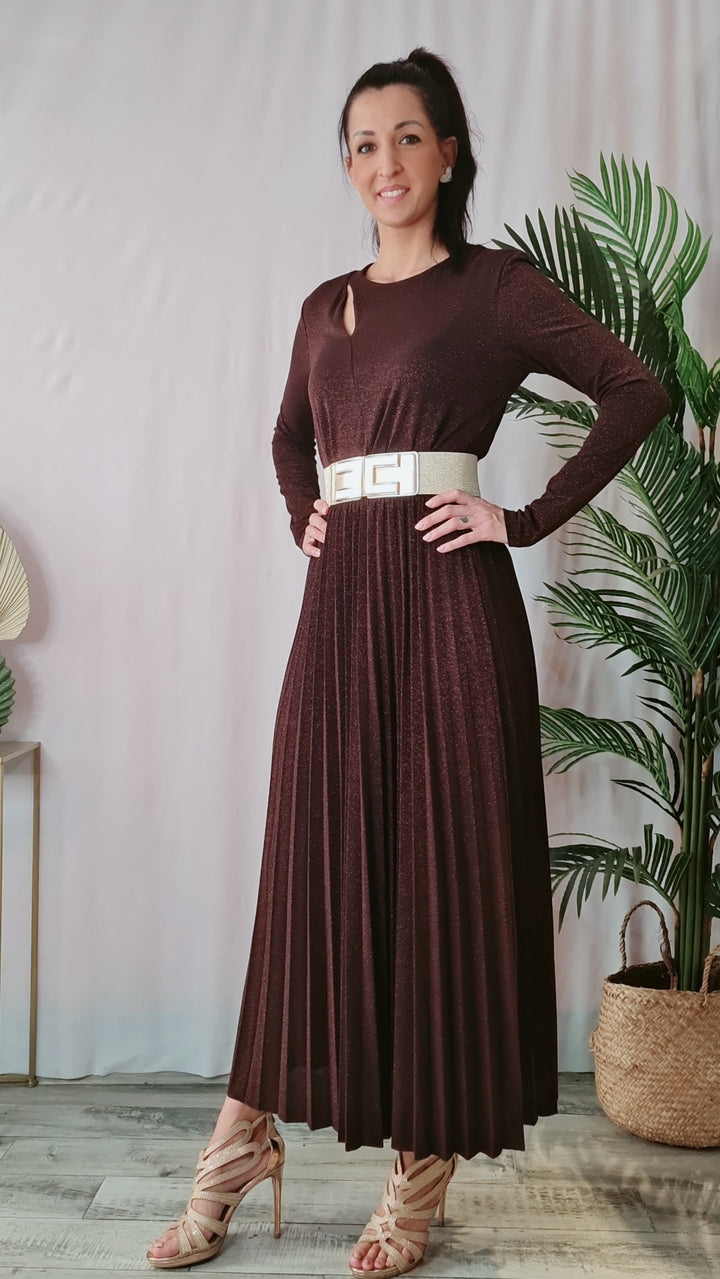 Abito in jersey filo lurex con manica lunga , gonna plisettata morbida sulla figura .