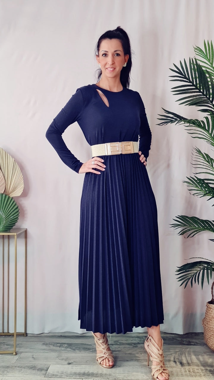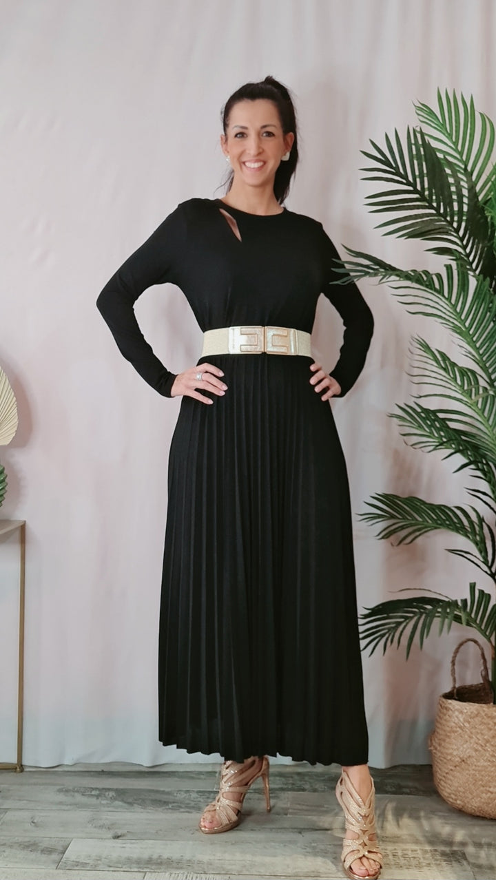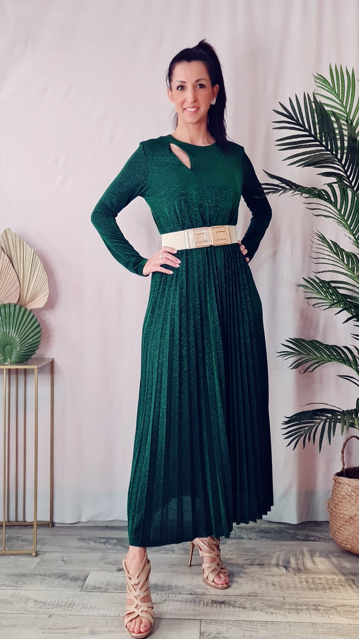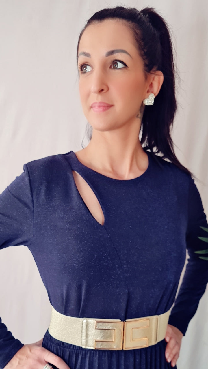 Abito in jersey filo lurex con manica lunga , gonna plisettata morbida sulla figura .