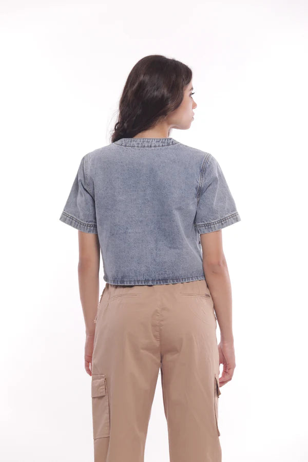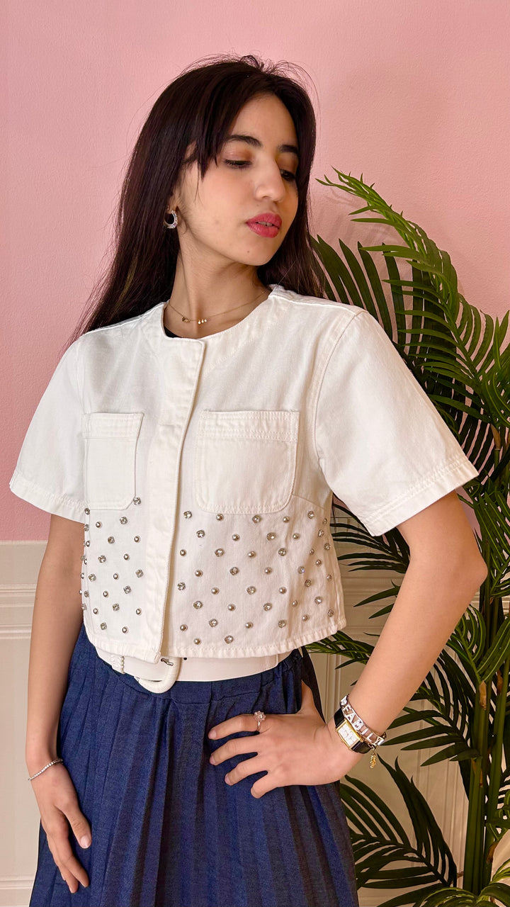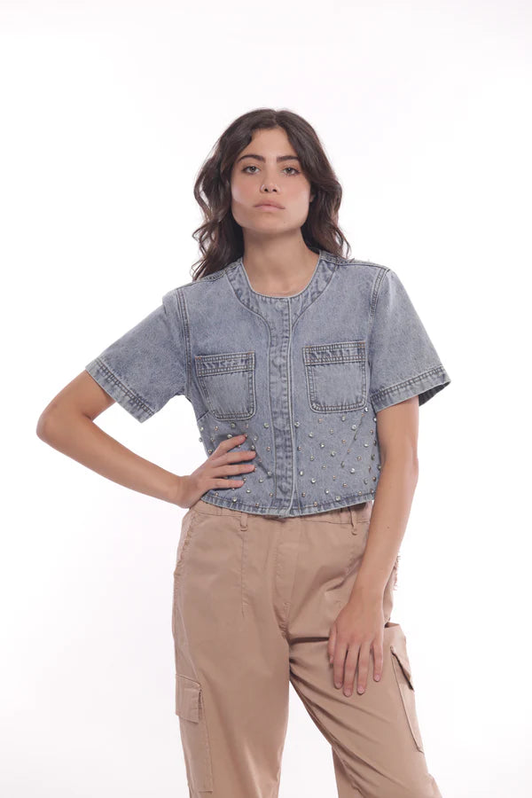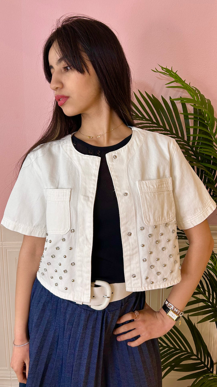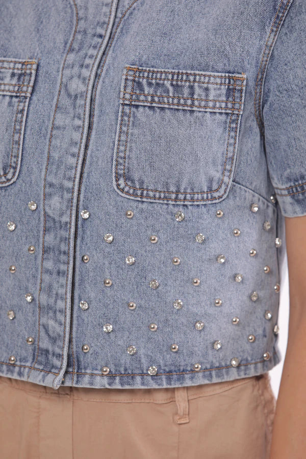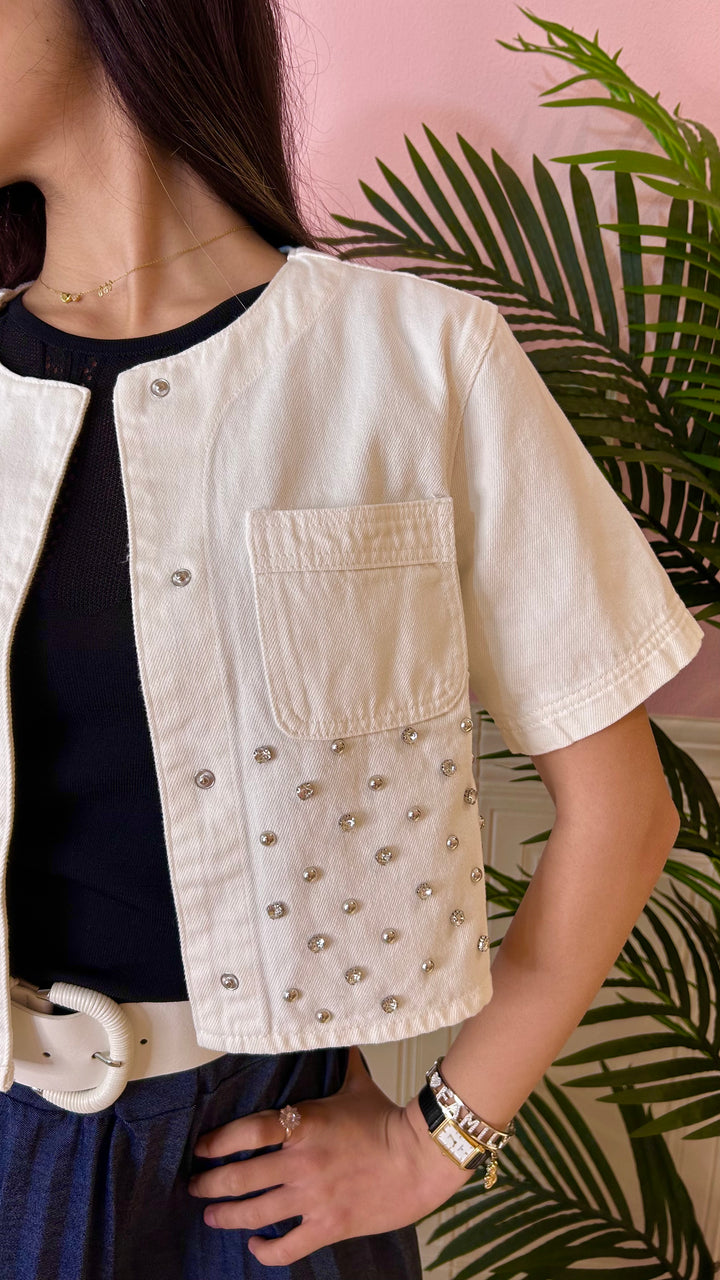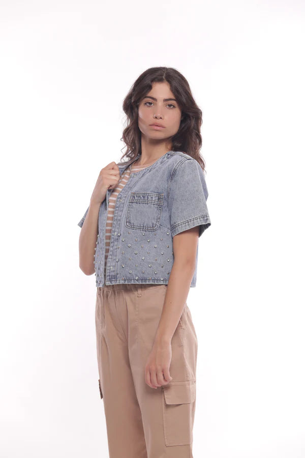 Giubbino in jeans crop con mezza manica e borchie strass.